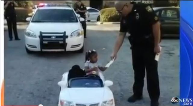 Una niña de 2 años de edad, en Jacksonville, Florida, tendrá que empezar a hacer algunas tareas ahora para pagar el “ticket” de 4 dólares que recibió el martes de agentes de policía cuando conducía su coche de juguete, un convertible blanco, alrededor de su complejo de apartamentos.